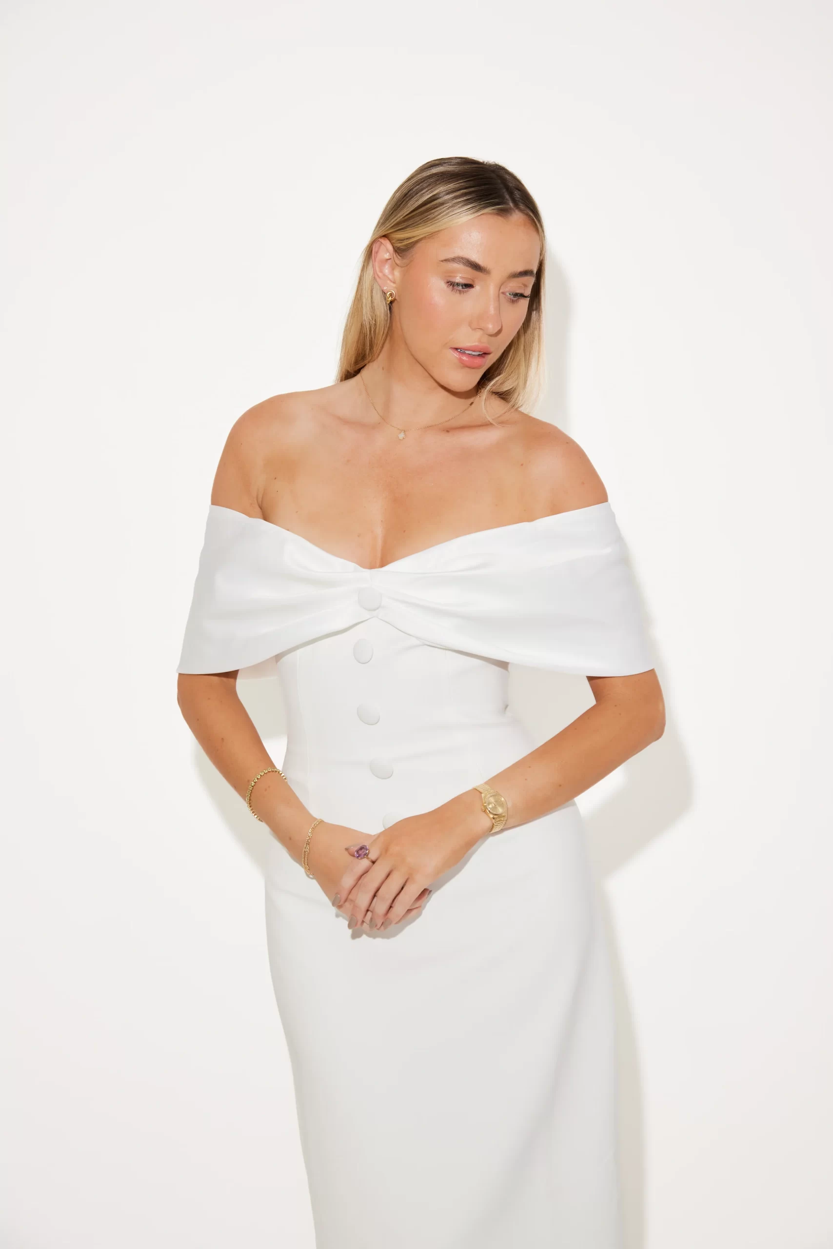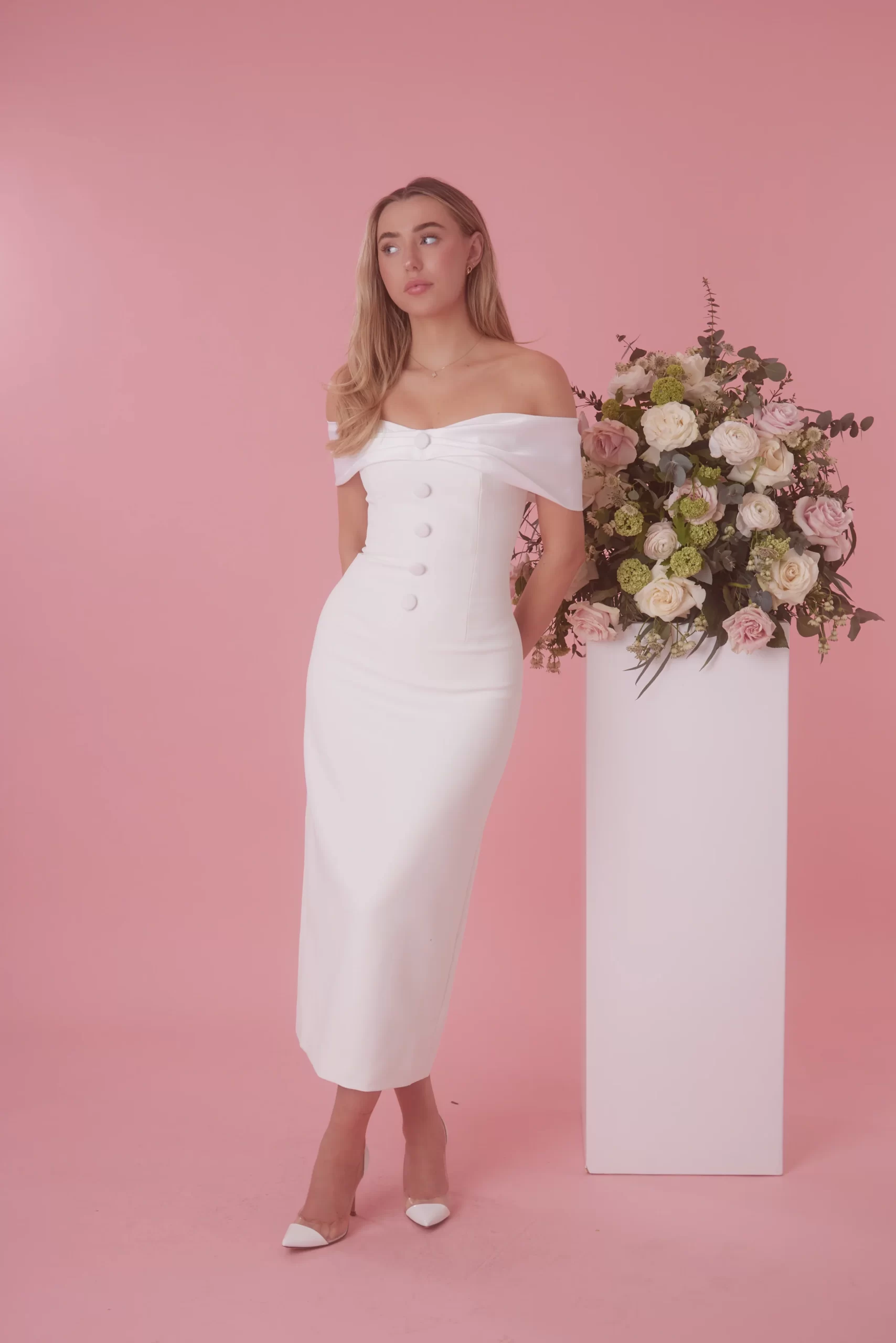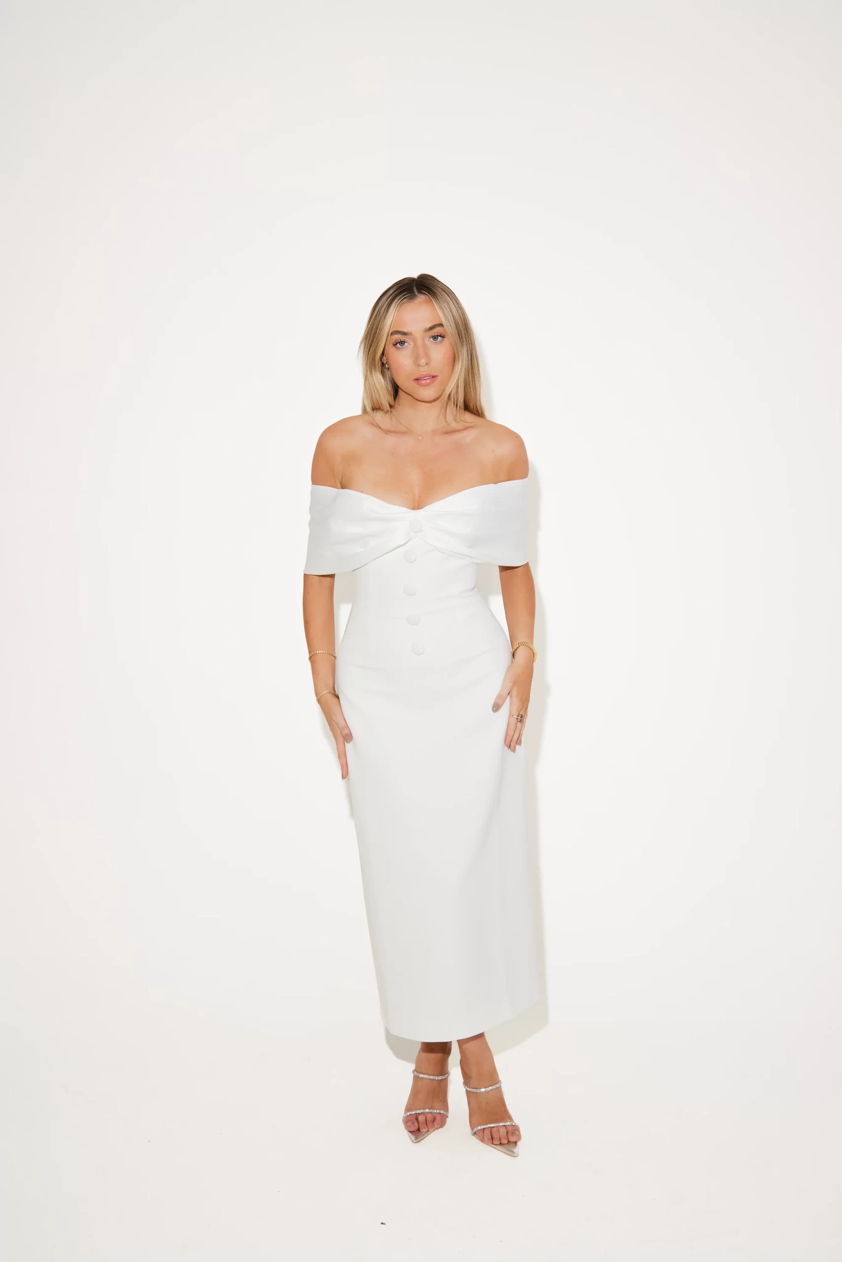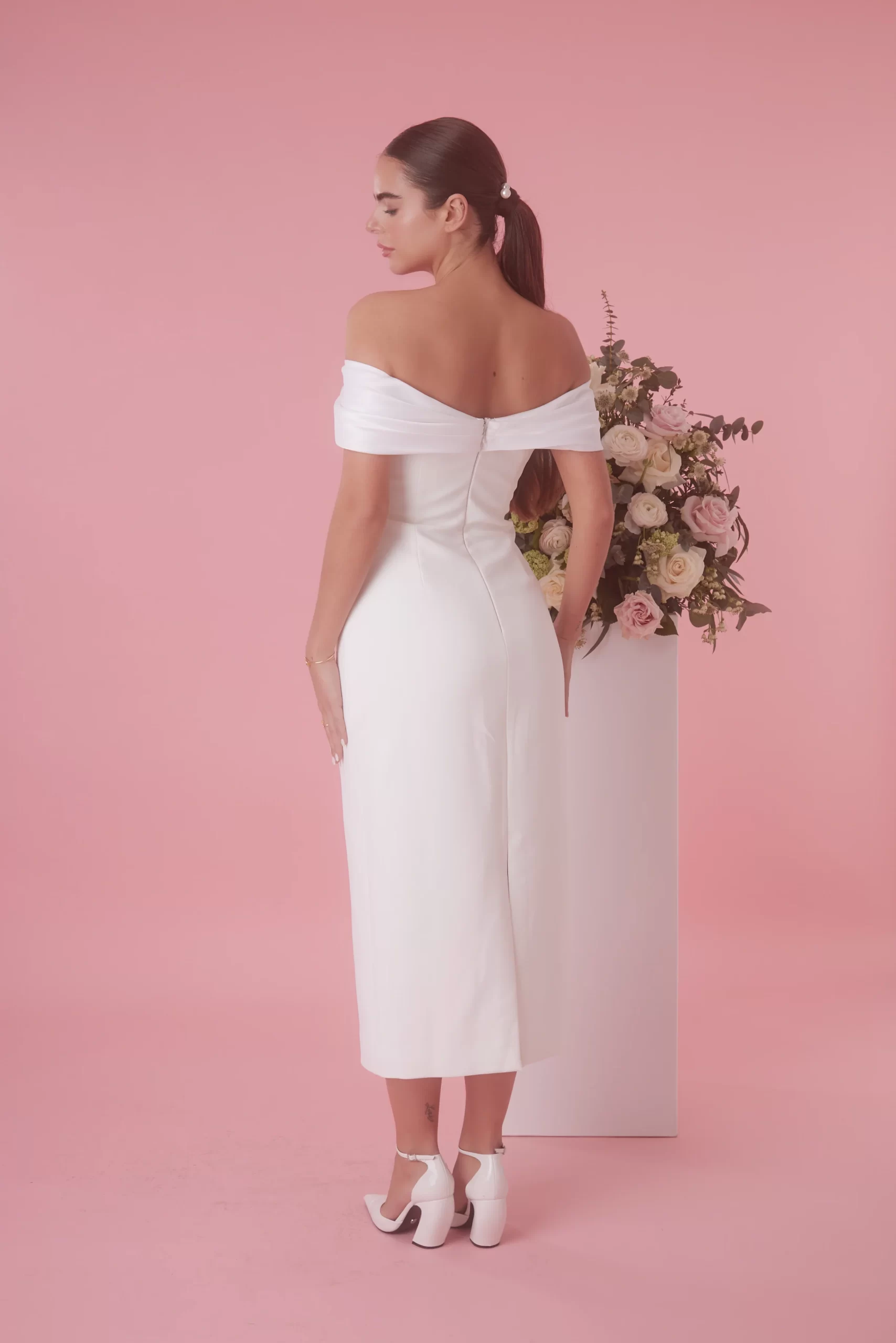 If elegance was a dress, she would be it. Defined by its sweeping, off-the-shoulder neckline carefully crafted in a satin bow silhouette. Taking our bridal bow design to midi lengths, the subtle contrast of the satin neckline and our signature luxury fabric that embodies the bodice seamlessly blends opulence with delicacy curating a classic look for the timeless brides. Designed in-house, this understated piece is further adorned with buttons to add a touch of sophistication.