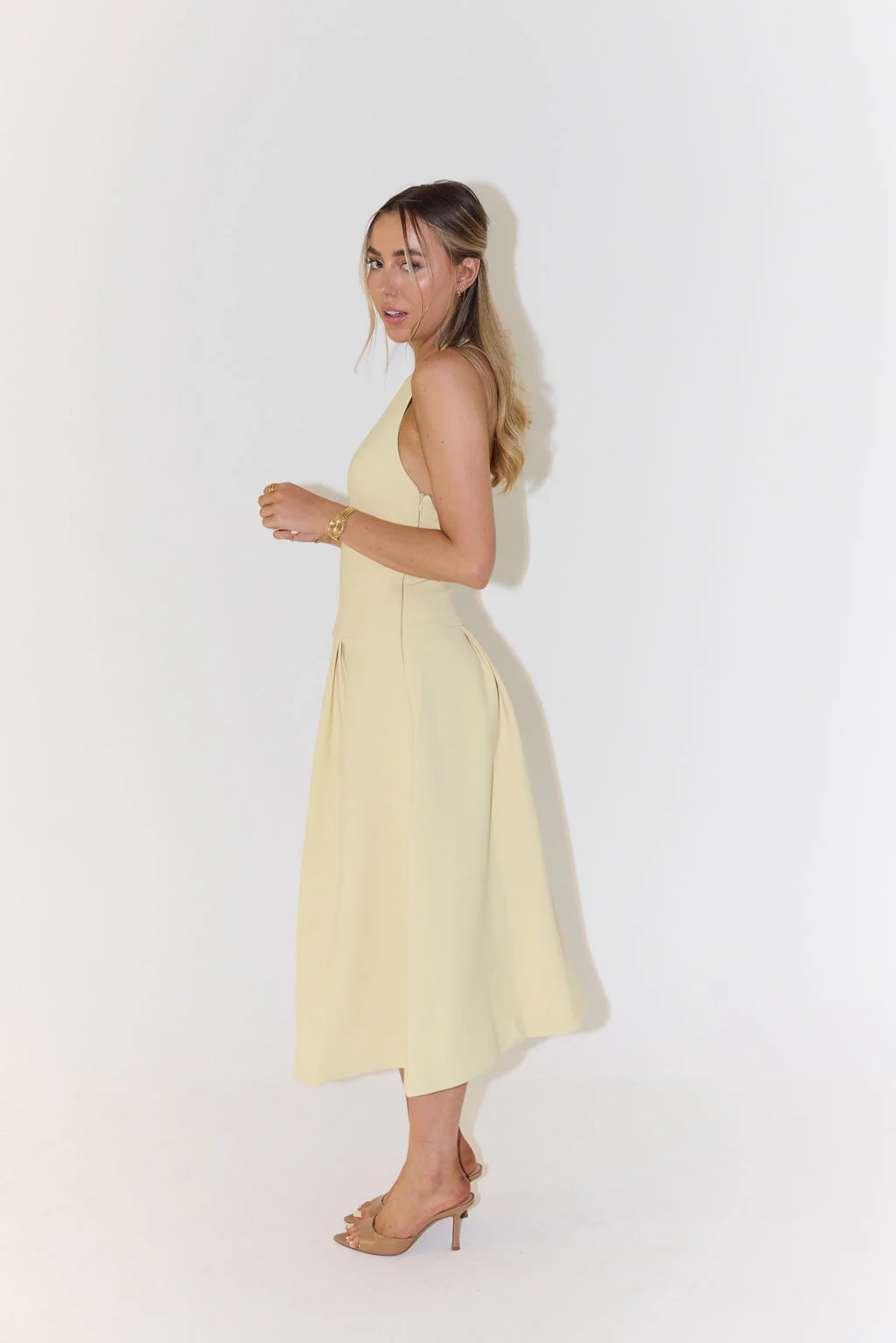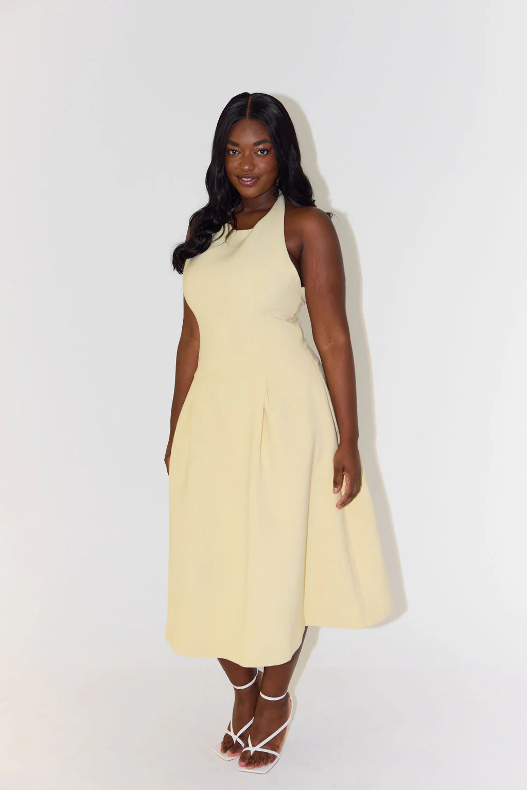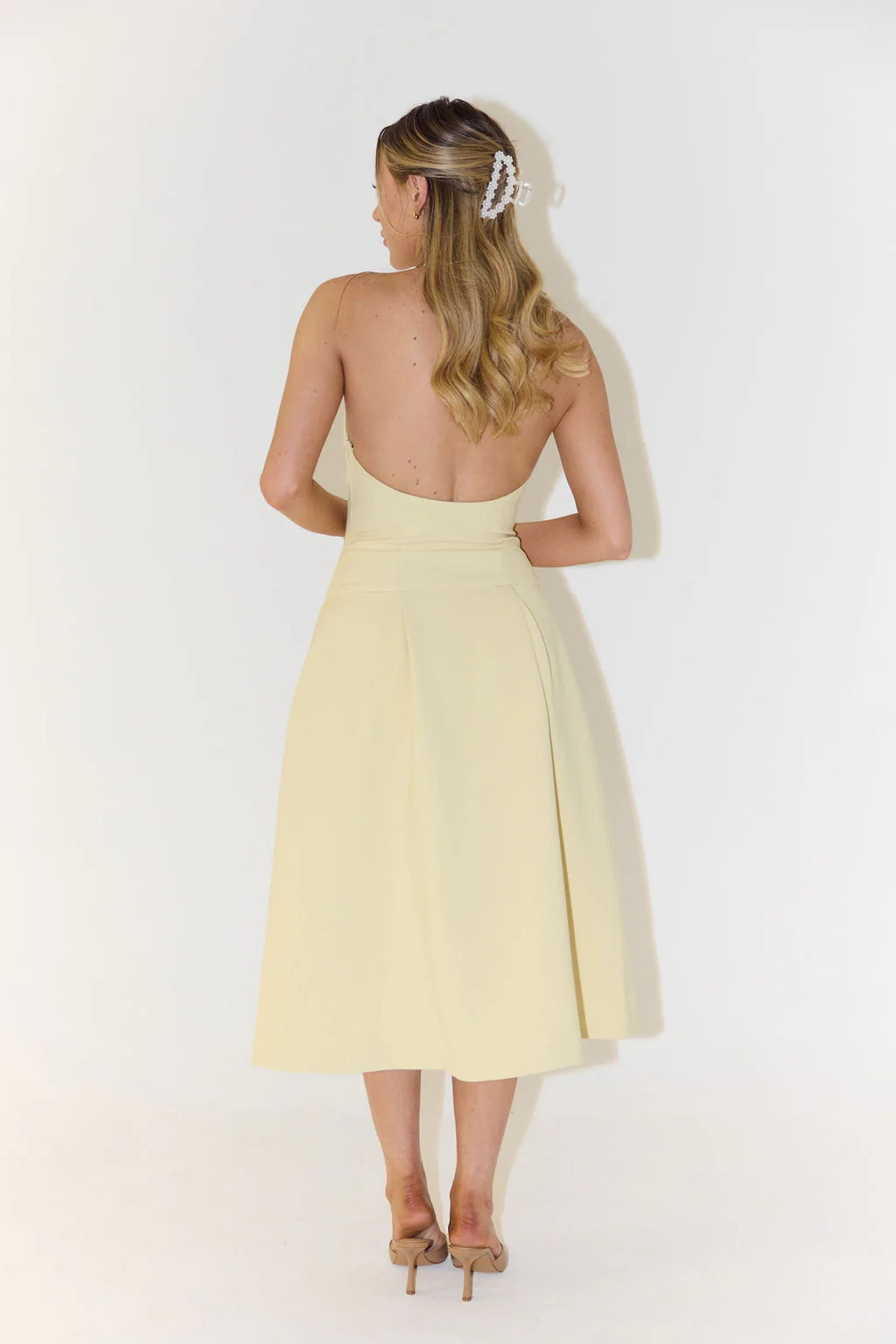 If elegance was a dress, she would be it. We are bringing our coveted dropped hem dress to midi lengths in a fresh lemon hue to inject a touch of timeless colour into your summer wardrobe. Boasting a sophisticated halter neck, two subtle darts for that Odd Muse signature cinch and a curved backless finish all defined by the classic drop waist. It’s all in the final touches for our muses.