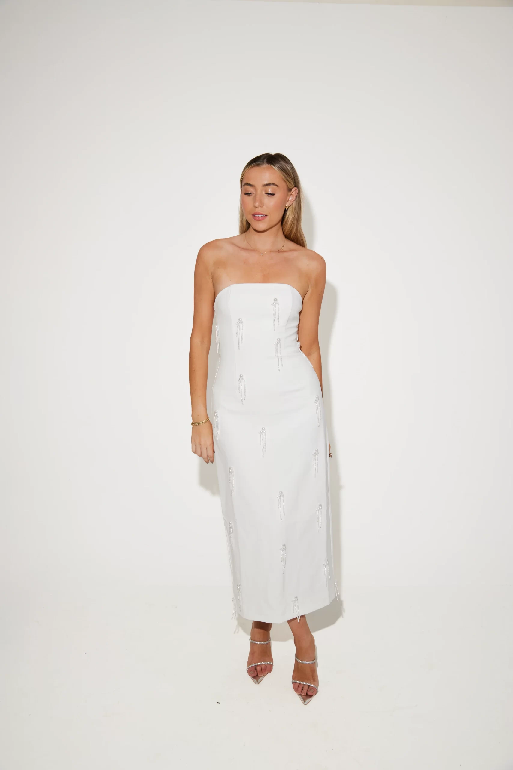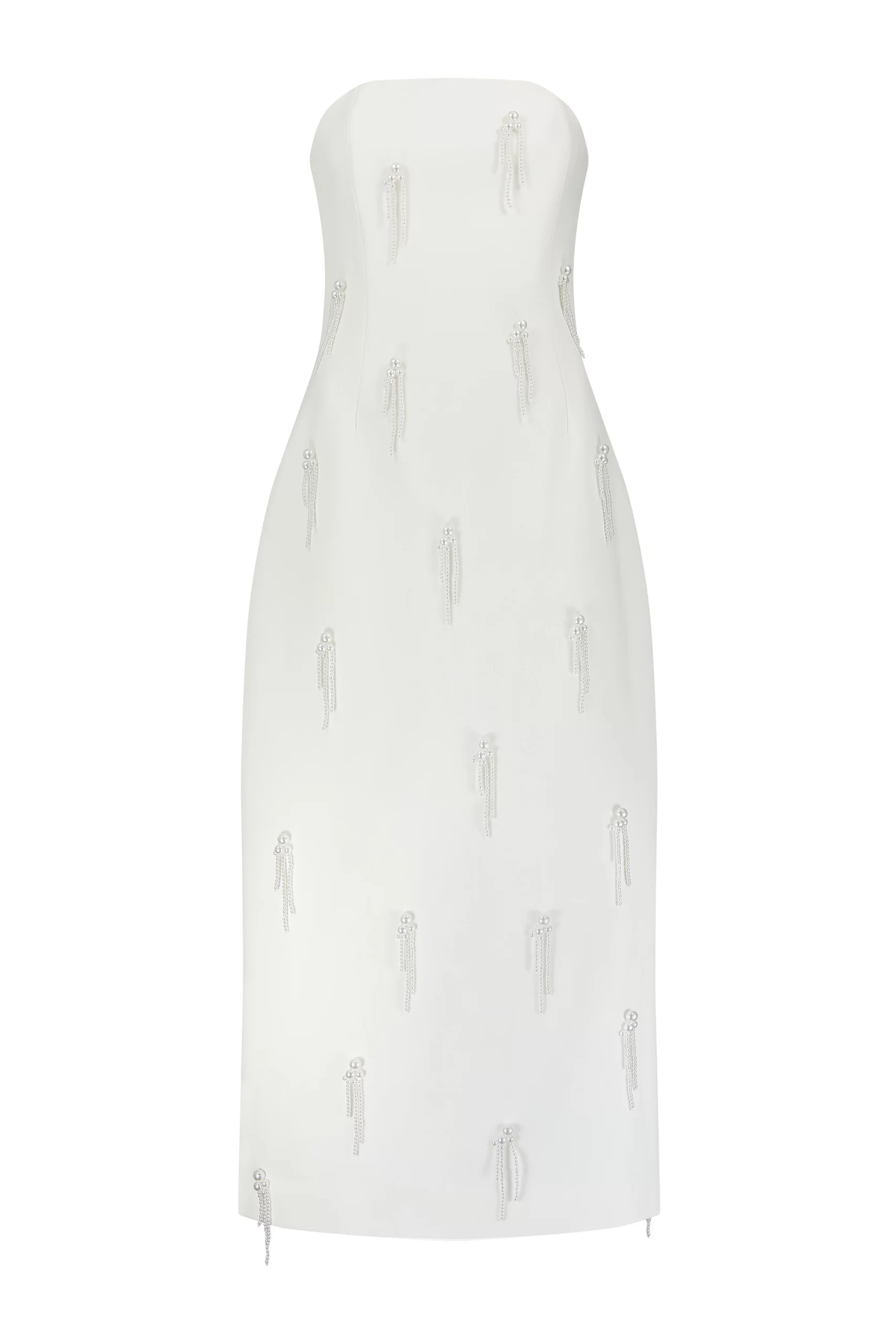 Cut from our long-adored signature fabric, the evolution of the pearls continues to offer timeless elegance to our brides-to-be. Adorned with delicate dropping pearl embellishments from back to front, this sharp strapless, crisp white piece delicately hugs the figure. Designed in-house, especially for our brides, let us be your ‘something new’ that you will love for a lifetime.