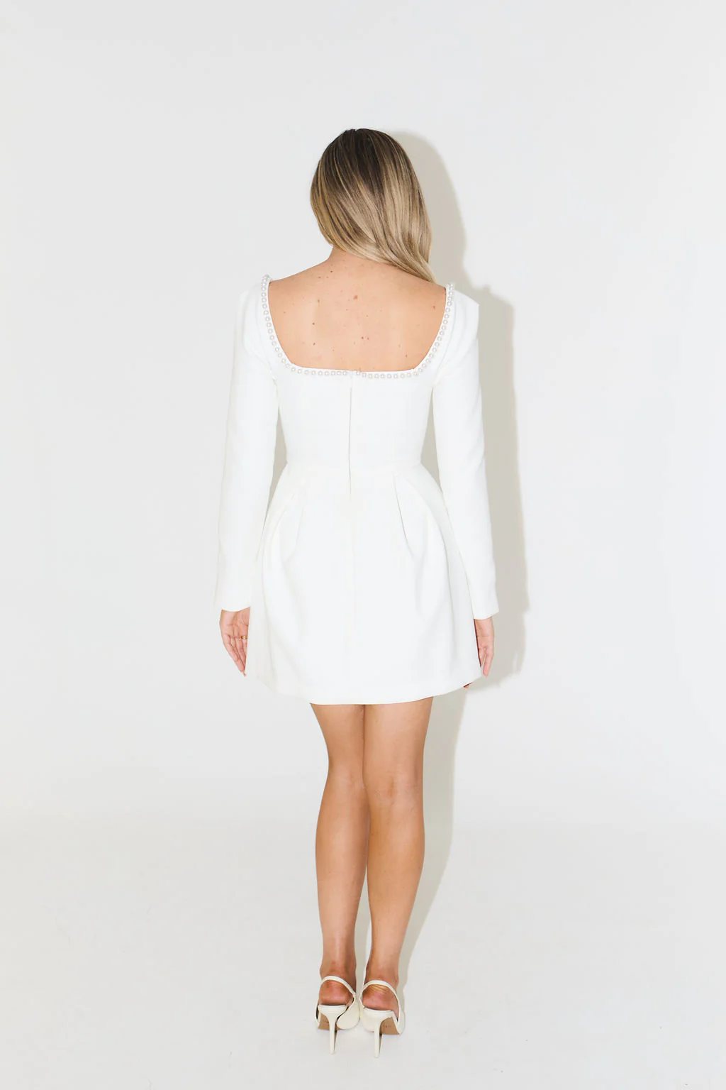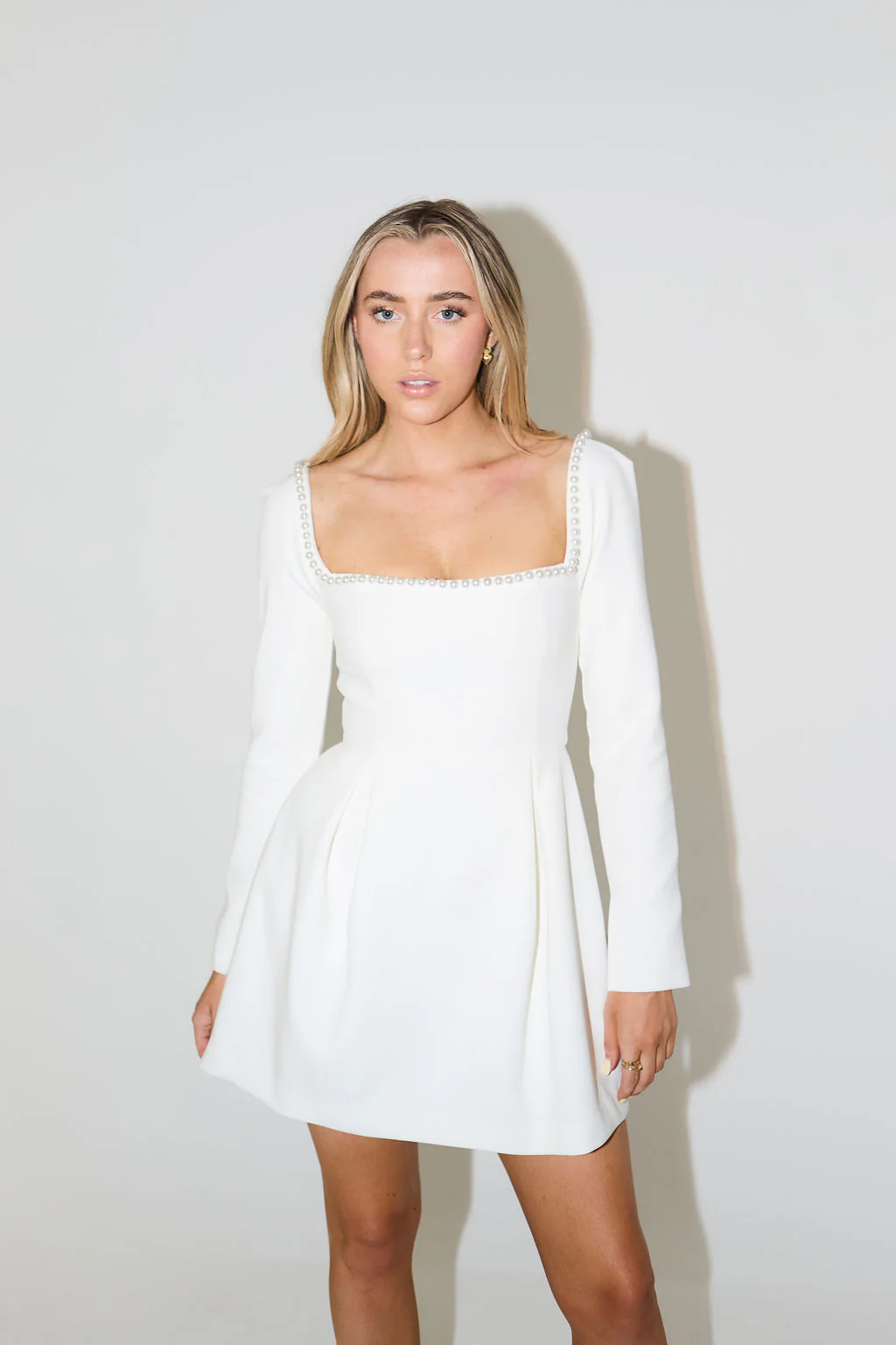 Where the evolution of the pearls began, our coveted best-seller in a crisp white iteration requested you. We listen to our muses, the pearl trim dress is back revised for a more comfortable and flattering fit in this new structure allowing for more movement. This sartorial party statement defined pearls as a distinguishing stamp of Odd Muse in our journey to elevate and cultivate your timeless wardrobe. Crafted with a flattering and staple square neckline, adorned with a delicate pearl trim to add a touch of opulence to this statement neckline, it’s all in the details, complete with a tailored bodice.