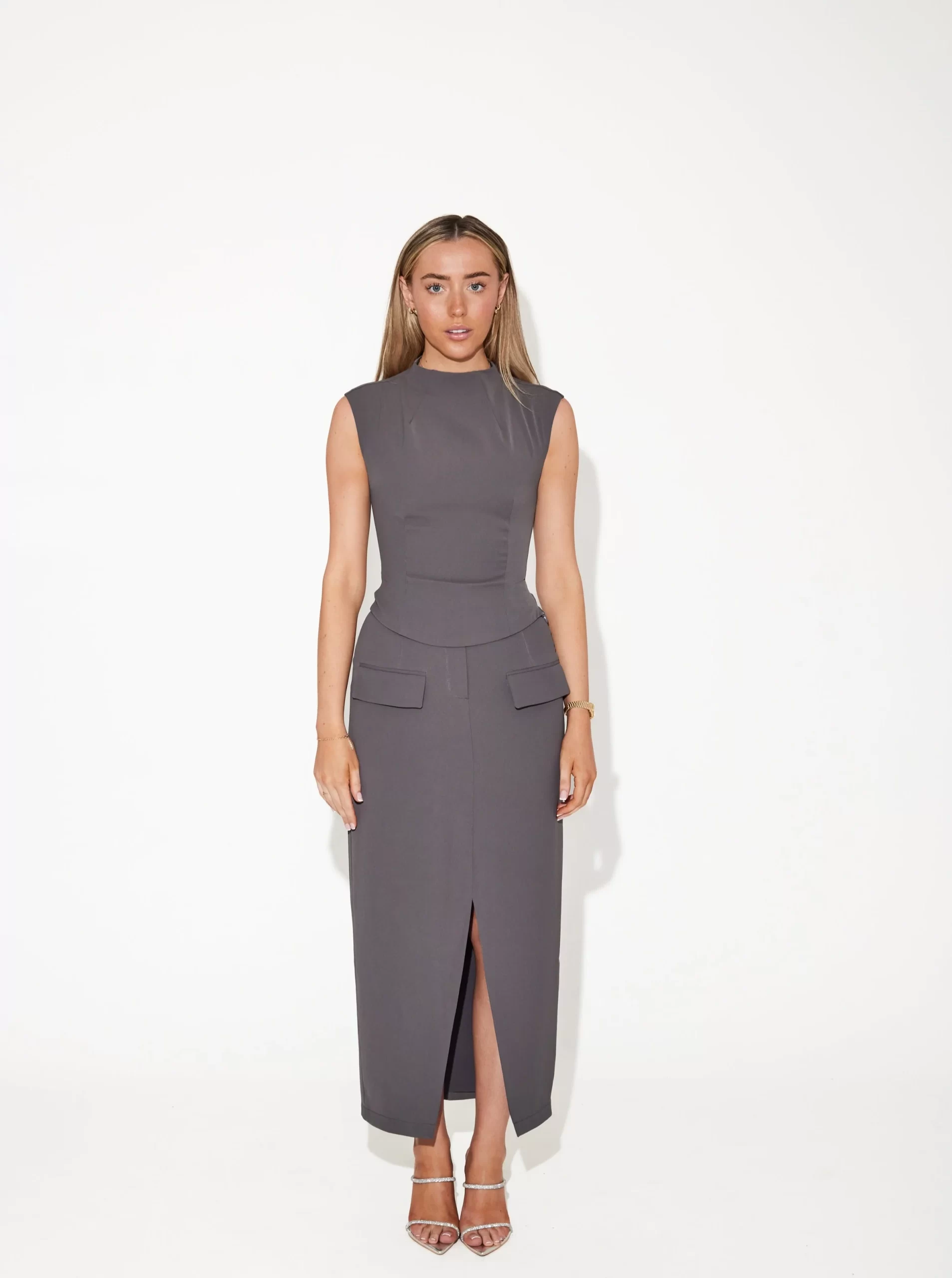 Make a simple statement with this core capsule piece. Elevate your everyday wardrobe with Odd Muse’s twist on tees in our statement slate grey. Crafted in our slinky yet structured signature fabric, this sleeveless design boasts an understated high neck and subtly curved hem completed with a hidden zip tailored to effortlessly hug your figure. It’s all in the final touches for our muses.