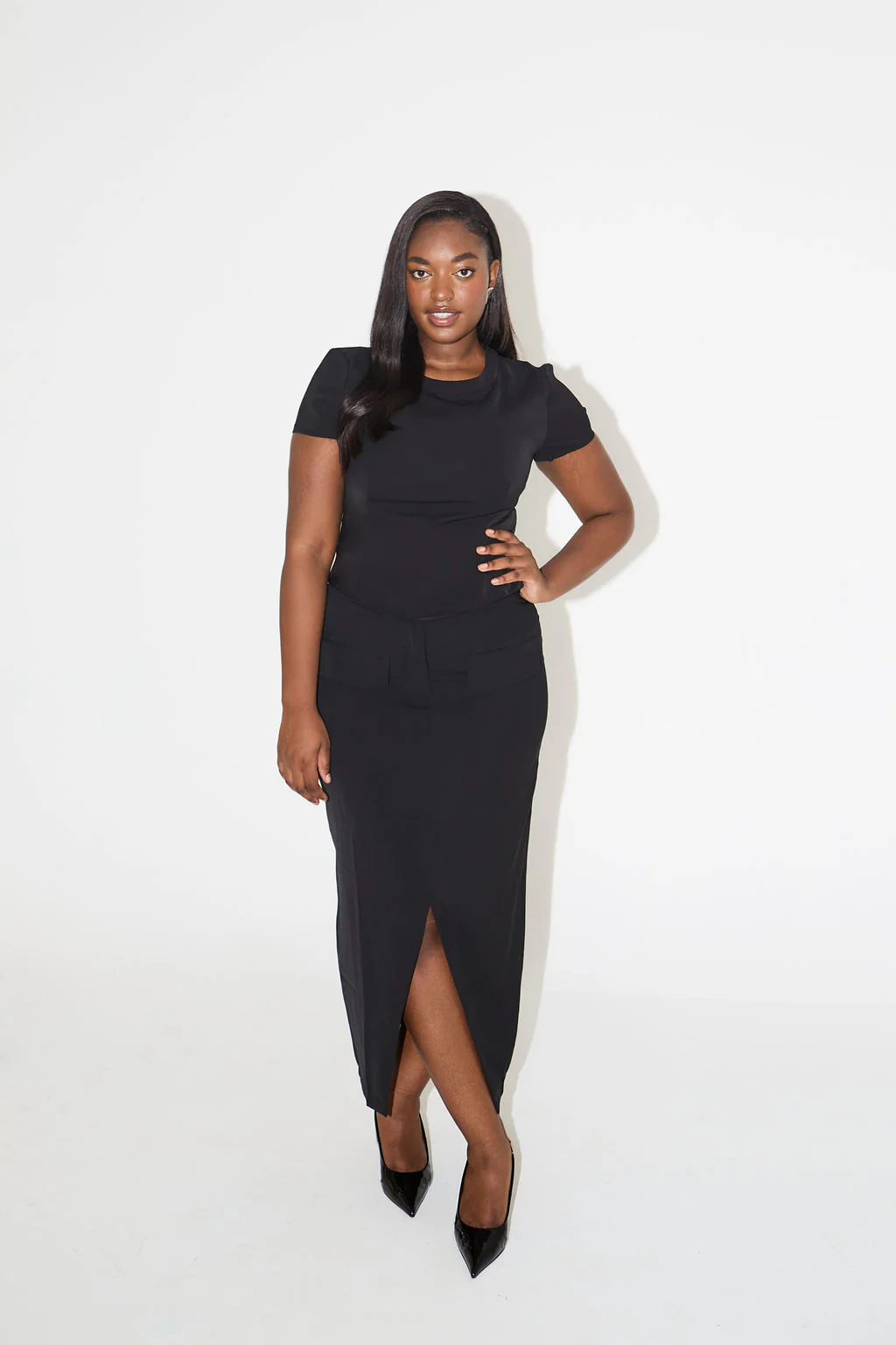 Make a simple statement with this core capsule piece. Elevate your everyday wardrobe with Odd Muse’s twist on tees. Crafted in our slinky yet structured signature fabric, this tee is beyond basic, defined by two front seams moulding the silhouette for a structured, understated look. Completed with a subtly curved hem completed with a hidden side zip tailored to effortlessly hug your figure. It’s all in the final touches for our muses.